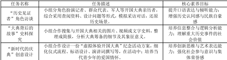 例如,在小学语文《开国大典》教学中,教师就可以引入特色合作探究项目,细化设计学科联合探究任务,以此为基础锻炼学生深度思维能力,培育学生语文核心素养。在深度推进合作探究教学的过程中,教师可以设计“重现历史时刻——《开国大典》精神传承”特色教学项目,在项目中以《开国大典》课文为载体,注重设计多维度合作探究任务,引导学生深入理解开国大典的历史意义,感悟民族精神,培养家国情怀,同时在项目中引入合作角色体验、史料分析和创意表达等任务,使学生在合作中深化文本理解,提升历史认知能力、语言表达能力和团队协作能力。在项目实践中,从引导学生参与合作探究的维度,教师可以设计如表1 所示项目任务,促进学生参与跨学科合作学习,从而提高学生合作学习能力,有意识地锻炼学生语文核心素养,增强学生对课程知识的学习体验,使学生在深度学习基础上实现全面发展。