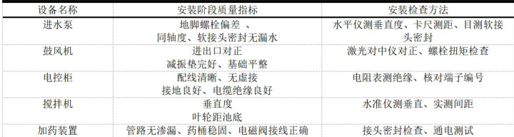 在参考本地污水处理厂机电设备管理规范的基础上,相关部门应当根据实际的设备应用场景、设备型号等确定安装与调试的工作指标,并严格按照工作指标 调试作业。如表一所示,表中为部分污水处理厂机电设备的安装阶段质量指标及检查方法, 善 相关 量指 调试阶段的质量检查指标可以同安装阶段的指标一致,在设备调试并产生运行参数的基础上,分别采用流量计测试、电流钳检测、压力计测压、听诊检测或热成像升温检测等参数化检测方式,配合安装阶段的检查方法获取配套的设备运行数据,保障机电设备安装与调试检查指标的可用性。