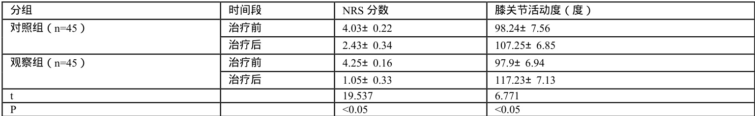 表1 对比两组患者的NRS 分数以及膝关节活动度差异