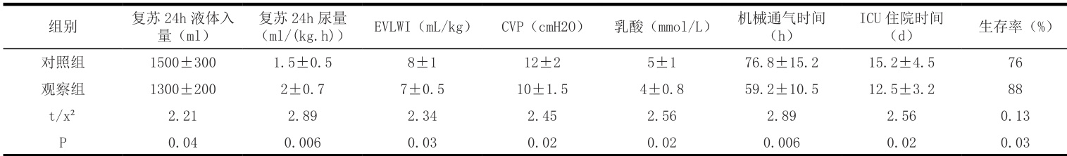 d vs.观察组的复苏 24 小时液体入量较对照组显著降低( 1 3 0 0 ± 2 0 0 ml vs. 1500±300 ml, P=0.04),尿量则显著 15.2±4.5 d, P=0.02)也显著减少。生存率在观察组中略有提高( 9 5 % vs. 90%, P=0.03)。EVLWI( 7 ± 0 . 5 mL/kg增加 ( 2 ± 0 . 7 m l / ( k g . h ) vs. 1 . 5 ± 0 . 5 ml/(kg.h), P=0.006)。此外,观察组的乳酸水平低于对照组(4±0.8 mmol/L vs. vs. 8±1 mL/kg, P=0.03)和 CVP(10±1.5