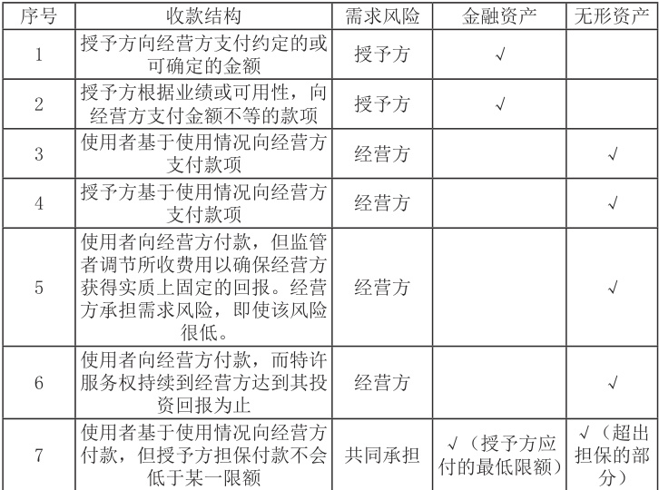 财政部和社会资本合作中心的《PPP 项目会计核算方法探讨》一书中,从项目公司收款结构和项目需求风险的识别上对 PPP 项目的资产核算模式进行了分类,其分类方式