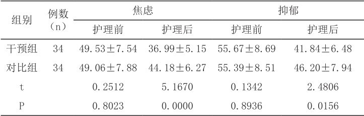 2.1 脑梗死后偏瘫患者护理前后焦虑、抑郁状态评分比较