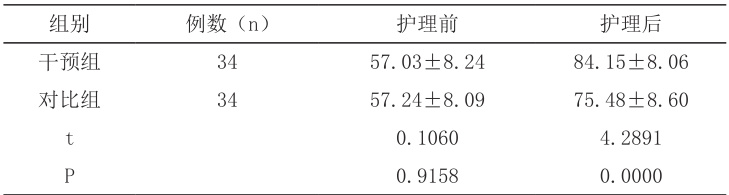 脑梗死后偏瘫患者护理前生活质量评分 P 值 > 0 . 0 5 ,无差异。干预组脑梗死后偏瘫患者护理后生活质量评分高于对比组患者, . P< 0 . 0 5 ,有差异。见表2。