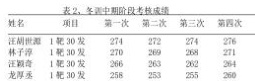 林子淳、汪胡世源、汪颖奇、龙厚丞在冬训阶段练习1 靶基本功时,结合表象训练,对自身的动作程序细化,1 靶30 发用了4 周的训练时间,4 次考核成绩均达到了268 环的要求。下表记录了冬训中期4 次考核的成绩。