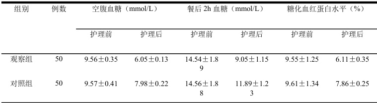 对比两组血糖水平,观察组护理后低于对照组,P<0.05,详见下表1。