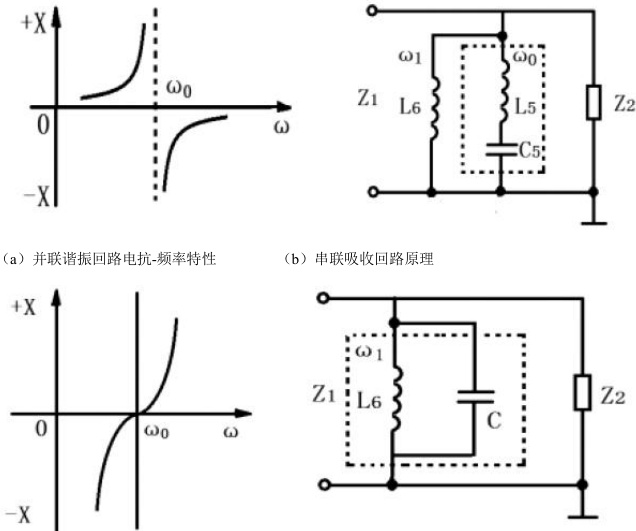 当一个平台上除了双塔频段以外还有其他发射频率时,须设置串联谐振系统来吸收其他频率,即陷波网络。如图1(a)所示,L5、C5 形成了串联谐振环来吸收ω0,假设工作频率ω 1< ω0(ω0 为被吸收的频率),可从图1(b)看出串联谐振系统的电抗随频率变化。通过观察图形的形状,发现对于ω1 这个频率,该回路为容抗。如果在其L5、C5 间加入了L6,则图为图1(b)中的等效模型图2(d),这是一个LC 并联回路。只需选适当的元件使其达到ω1 处的并联谐振(具有无穷大的阻抗),这样就能达到对ω0 的吸收而不会影响ω1 的配置。反之,若ω1>ω0,只需要将其L6 换为C6 即可。