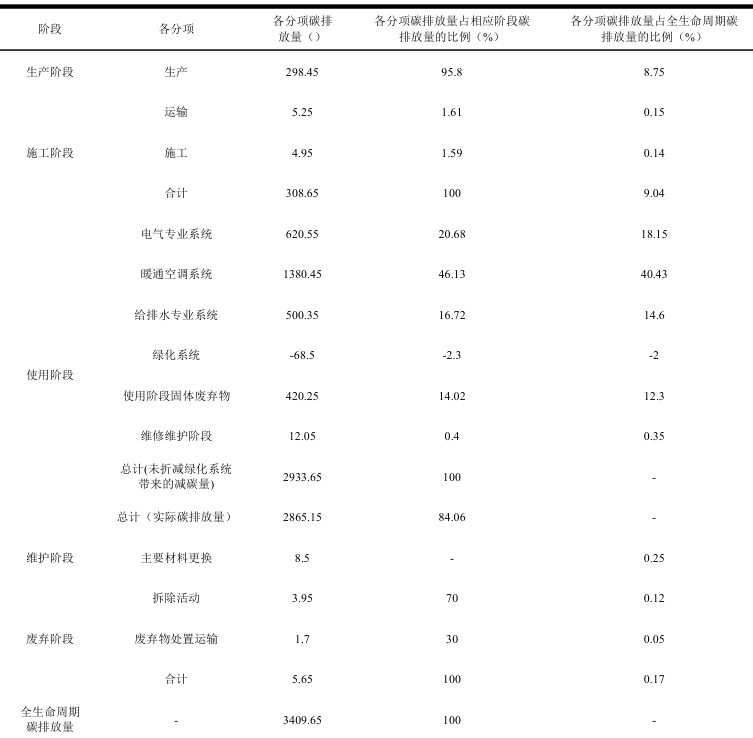 在湖南省绿色建筑碳排放核算结果分析中,结合建筑生命周期的碳排放量,详细计算和分析了各阶段的碳排放量,核算结果以表格形式呈现如