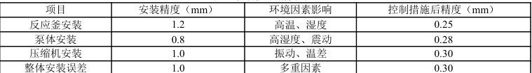 采取以上措施后,本项目设备安装精度有明显提高。经过一年多的现场施工和安装,最终使设备的安装误差小于0.3mm,达到了高精度的要求。这不仅能有效地确保设备长时间的稳定运行,而且还能提高整个生产线的效率与安全。表1 显示了在项目实施之 实施 设备安装精度的变化情况。采用精密激光量测技术,环境监测及动态调校系统,使每台设备的安装精度均有显著提升。例如,反应器的安装精度由1.2mm降至0.25mm,本体误差由0.8mm 降至0.28mm,整体安装误差由 1.0mm 降至0.30mm,满足了本课题对高精度设备安装的需求。