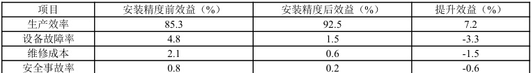表 2 展示了通过提升安装精度后,生产线的整体效益分析。设备安装精度的提高直接推动了生产率的提高,使生产率由85.3%提高到 92.5% ,增幅达到 7.2% 。另外,设备的故障率和维护费用明显下降,从 4.8% 下降到 1.5% ,维护费用降低 1.5%, 。更重要的是,随着设备安装精度的提高,安全事故发生率明显降低,安全事故发生率由 0.8% 下降到 0.2% ,使生产现场更加安全稳定。