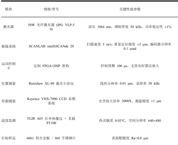 2.2 实验设计实验 1:振镜动态性能优化验证目标:对比 ASMC+AFF vs 传统PID 的阶跃响应与轨迹跟踪精度方法:阶跃测试:X 轴振镜从 0±10mm 阶跃运动,记录响应时间、超调量、稳态误差。轨迹跟踪:扫描直径 5 mm 圆形路径(速度 2m/s, )与 45°锯齿波(频率 100Hz) ),测量几何失真度。实验 2:激光功率控制一致性验证目标:评估模糊自适应PID 在不同材料/速度下的线宽稳定性方法:在铝/不锈钢表面打标 10 条平行线(长 20mm ,间距 1mm) )。变量:扫描速度: 500mm/s, 1000 mm/s, 2000 mm/s功率控制模式:固定功率 / 固定PID / 模糊自适应PID测量:每条线宽均值及标准差(取 5 个测量点)。实验 3:热变形补偿效果验证目标:测试 ANN 热误差模型对长时间漂移的抑制能力方法:热漂移标定:振镜满负荷扫描 4 小时,记录温度(T₁\~T₃)与零点漂移(ΔX, ΔY)。ANN 建模:3-10-2 网络结构(输入:T₁,T₂,T₃;输出:ΔX_pred, ΔY_pred),训练集 RMSE<1.5 μm。补偿对比:组A(无补偿):直接打标 0.1mm 精密网格组 B(ANN 补偿):位置指令叠加 -ΔX_pred, -ΔY_pred。2.3 实验结果2.3.1 振镜动态性能实验结果表2-2 振镜阶跃响应性能对比(X 轴 ±10 mm)