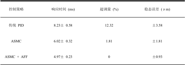 表 2-2 展示了振镜阶跃响应性能对比。传统 PID 控制下,振镜响应时间达 8.23±0.58ms ,超调量为 12.32% 稳态误差 ±3.58μm ;ASMC 控制使响应时间缩短至 6.02±0.32ms ,超调量降至 1.81% ,稳态误差 ±1.81 μm;而 ASMC+AFF 策略进一步将响应时间优化到 4.97±0.23ms ,完全消除超调,稳态误差低至 ±0.93μm 。表2-3 轨迹跟踪误差对比(单位:μm)