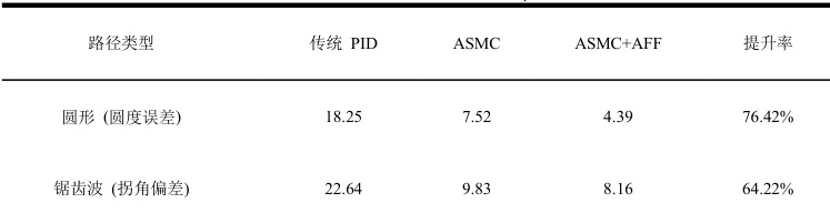 在轨迹跟踪实验中,传统 PID 控制的圆形路径 .25μm,锯齿波拐角偏差为 22.64μm; ;ASMC策略使圆度误差降至 7.52μm ,拐角偏差 9.83μm 策略效果最佳,圆度误差仅 4.39μm ,拐角偏差 8.16μm ,相比传统 PID, 圆度误差提升率 76.42% 拐角偏差提升率为 64.22% 。这表明 ASMC+AFF策略显著增强了振镜动态响应与轨迹跟踪能力,有效克服了系统非线性与动态滞后问题。