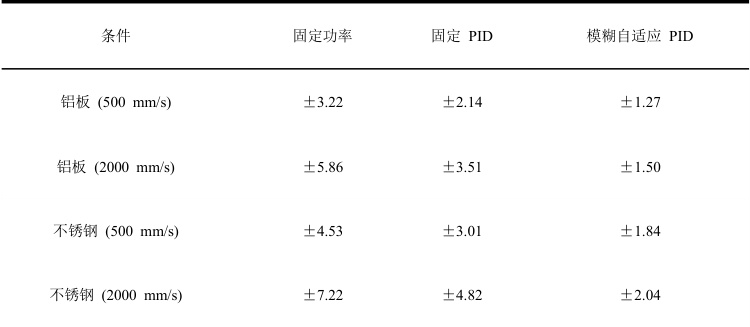 从表2-4 线宽一致性对比数据可知,固定功率模式下,铝板与不锈钢板在不同扫描速度时线宽标准差波动较大;固定 PID 控制虽有所改善,但仍无法完全适应材料与速度变化;而模糊自适应 PID 控制表现出色,在铝板 500 mm/s 扫描时,线宽标准差从 ±3.22μm 降至 ±1.27μm; ;在不锈钢板 2000mm/s 高速扫描时,标准差从 ±7.22μm 大幅缩小至 ±2.04μm ,整体将线宽波动缩小 40 - 60% ,且有效抑制材料非线性效应,使铝、不锈钢板线宽标准差差异从 2.7μm 降至 0.5μm ,保证了不同工况下打标效果的一致性。