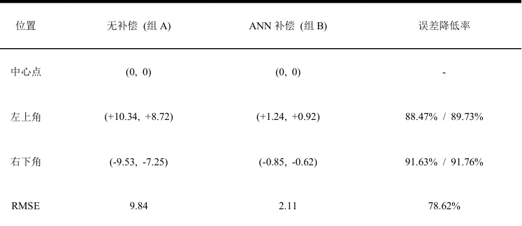 热漂移补偿效果数据显示,未补偿的组 A 在 4 小时运行后,左上角位置偏差达 (+10.34, +8.72)μm,右下角为 (-9.53, -7.25)μm,整体均方根误差(RMSE)为 9.84μm ;采用 ANN 补偿的组 B,左上角偏差缩小至 (+1.24,+0.92) μm,右下角为 (-0.85, -0.62)μm,RMSE 降至 2.11μm,误差降低率达 78.62%。这充分证明基于 ANN的热误差模型能够准确预测热漂移,并通过实时补偿有效抑制系统热变形,提升长时间运行下的打标精度稳定性。