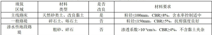 由于该工程沿线主要为红粘土及残积风化岩,部分土壤含水量高,粘聚性强,需掺加石灰、粉煤灰等改良措施,以提高其工程适用性。在交通荷载较大的主路床区,严禁采用草皮土、腐殖质土和高岭石和伊利石组分高的膨胀土。针对不同填方区填料特性的差异性要求,开展路基关键填料筛选与强度复核,保证各组分材料级配合理和工程兼容性。为提高路堤的承载力和抗水稳定性,路基主体部分采用碎石、天然砾石,局部掺入石灰改良。对于渗透性强的河谷地段,采用粗砂、碎石等填料,以保证填筑后具有较好的防渗效果。