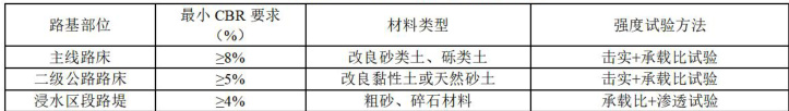 由于频繁的交通荷载作用,路基填料的 CBR 值不能小于 8% ;二级公路路段的路基强度可以降低到 5% 以下,但是仍然要满足压实度、变形模量的要求。针对水浸地区和临近水系的路基,采用透水性好、 CBR 不小于4%的粗粒料作为路基填料,避免因地下水引起的承载能力降低或材料劣化。材料的 CBR 值是用室内击实法测定的,所有进场材料都要出具检验报告。对掺加石灰、粉煤灰的粘质材料,需对其进行龄期试验,以保证其7 天龄期CBR 值在规定的下限以上。在施工过程中,对各层回填后的 CBR 值进行抽检,并对不符合要求的部位及时进行修补。采用 CBR分级管理、强度分区划分等措施,保证不同荷载、环境条件下路基体系整体稳定及服役寿命。