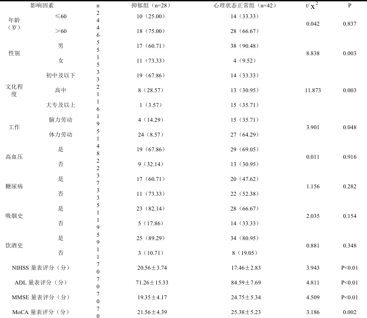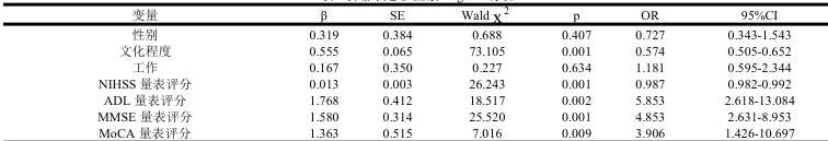 单因素分析结果显示,性别、文化程度、工作、NIHSS 量表评分、ADL 量表评分、MMSE 量表评分、MoCA 量表评分对比差异显著(P<0.05),年龄、高血压、糖尿病、吸烟史、饮酒史对比均无显著差异性(P>0.05),见表 1。表 1 抑郁状态单因素分析[n(%)]