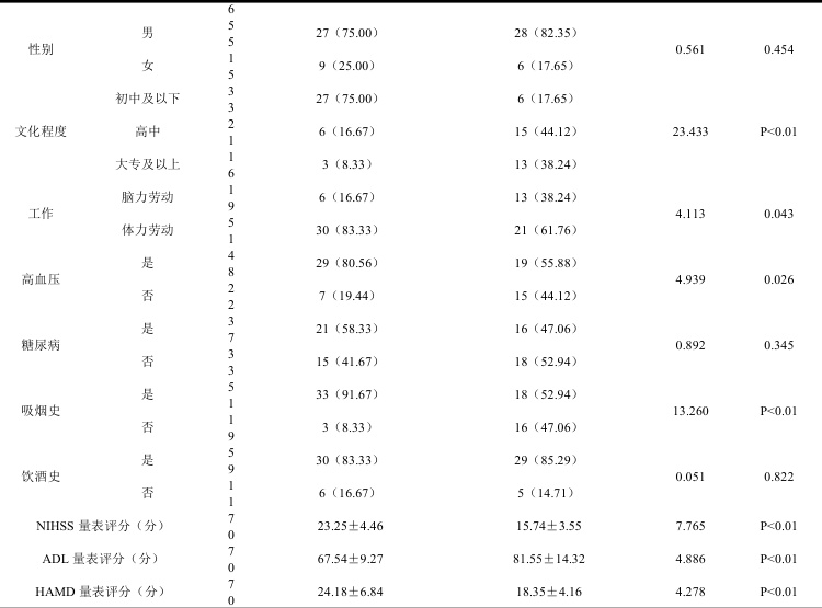 一般资料收集:患者入院后收集完整的病例资料,内容包括但不限于年龄、性别、文化程度、工作、神经功能、日常生活能力、吸烟史、饮酒史、高血压、糖尿病等。文化程度:初中及以下、高中、大专及以上;神经功能采用美国国立卫生研究院卒中量表(The National Institutesof Health Stroke Scale,NIHSS)进行评估,包括认知、语言、意识、视野、肢体运动和感觉等内容,总分 42 分,得分为 0 分表示正常,分数与认知功能缺损程度呈正相关性;日常生活能力采用日常生活活动能力量表(Activity of Daily Living,ADL)进行评估,内容包括饮食、洗澡、衣服穿脱、移动等,总分100 分,分数与生活能力呈正相关性;吸烟史:以持续不间断吸烟超过 6 个月以上定义为吸烟,以完全不吸烟或戒烟超过 15 年以上定义为不吸烟;饮酒史:以持续1 年、平均每周饮酒不少于2 次定义为饮酒,以完全不饮酒或近 1 年不饮酒定义为不饮酒。