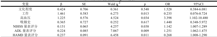 单因素分析结果显示,文化程度、工作、高血压、吸烟史、NIHSS 量表评分、ADL 量表评分、HAMD 量表评分对比差异显著 (P<0.05) ),年龄、性别、糖尿病、饮酒史对比均无显著差异性(P>0.05),见表 3。表 3 认知障碍单因素分析[n(%)]