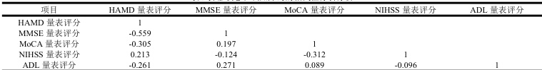 Spearman 相关性分析结果显示,HAMD 量表评分与 MMSE、MoCA 量表评分、ADL 量表评分存在显著负相关性,与 NIHSS 量表评分