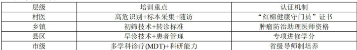乡级:培养全科医生掌握常见肿瘤筛查、初步诊疗和转诊能力;配备公共卫生人员负责肿瘤防控项目管理。