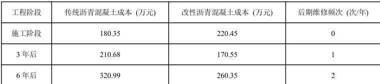 另外,虽然改性沥青混凝土初建成本较高,但耐久性能好,裂缝率低,可以大大减少后期维护成本和维护频率。从表2 可以看出,虽然改性沥青混凝土初期投资较大,但是后期养护次数及维修费用都低于常规沥青混凝土,具有良好的经济耐久性。