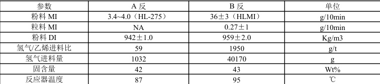 在单峰型树脂生产中,两个反应器的操作条件是近似的,而在钛系双峰型树脂生产中,它们的反应进料与操作条件均不同,区别在于一反加入己烯-1 共聚单体和微量氢气,生产出低密度低指数的粉料,反应温度较低;二反不加入己烯-1 而加入大量氢气,生产出高密度高指数的粉料,反应温度较高。