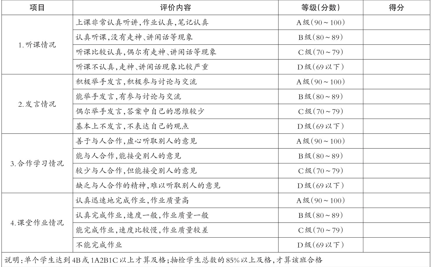 课堂行为习惯的养成是一个渐进的过程,科学合理的评价体系是检验养成效果、调整培养策略的重要依据,能够长期督促学生不断改进不良的课堂行为习惯。本研究提出从评价标准的立体化构建、评分方法的多元化实施、评价结果的动态化应用三个层面构建课堂行为习惯评价体系,以解决乡村小学起始年级学生课堂行为习惯存在的问题。