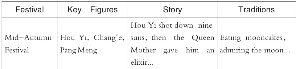 布置任务让学生扫读文章,找出与中秋节简介、嫦娥奔月故事中的关键人物(后羿、嫦娥、庞蒙等)以及与传统习俗相关的信息,并用表格形式进行整理。例如: