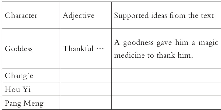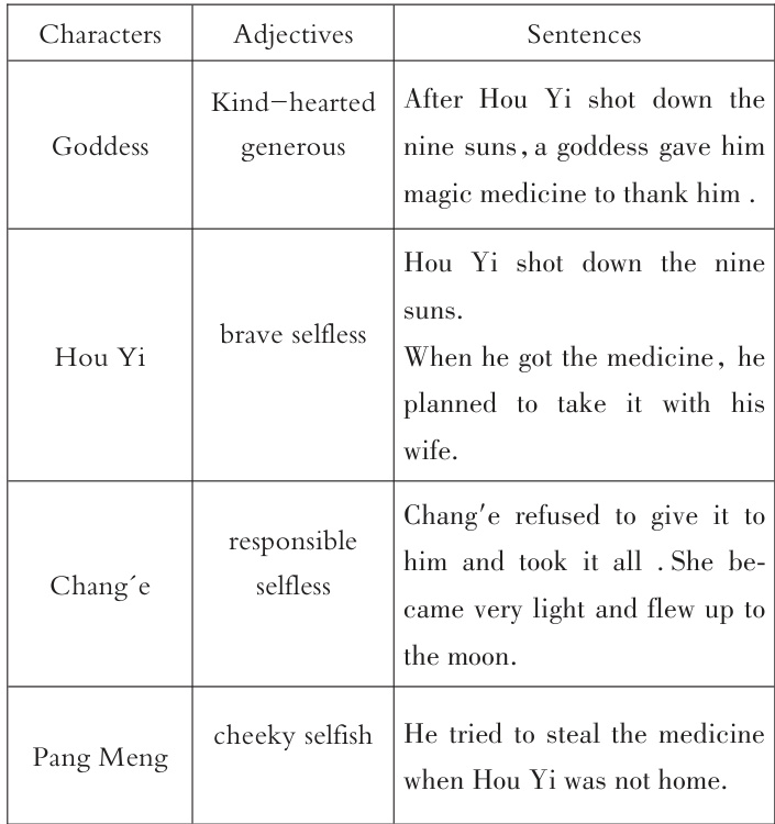 让学生分组讨论嫦娥奔月故事所反映的中国传统文化价值观,探索分析人物性格品质及动作所隐含的感情,并鼓励学生用英语表达自己的观点。这有助于培养学生的思维品质和文化意识。这一环节不仅可以检验学生对文章内容的理解程度,还能锻炼学生的语言表达能力。(讨论中完成表格)