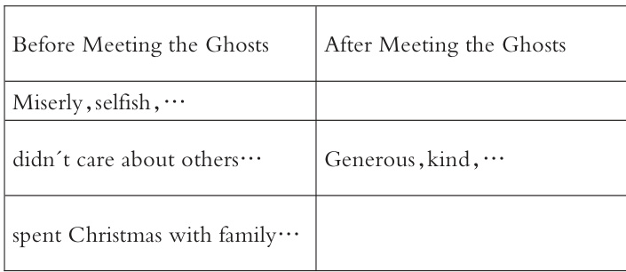 布置任务让学生扫读文章,找出Scrooge 在遇到三个鬼魂前后的不同表现,并用表格的形式进行整理。例如: