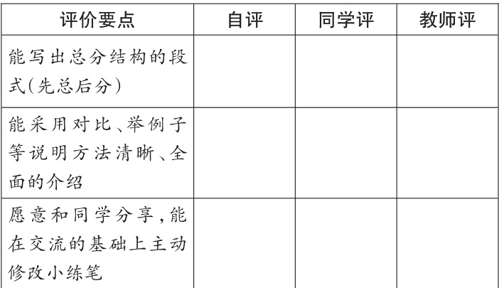 以《飞向蓝天的恐龙》一课的读写评价为例,为落实教学目标“品读课文中对比表达的语段,尝试运用到表达中。”教师设计了如下的课堂练笔活动:课文第四段中第3-6 句围绕“形态各异”,用总分的方式介绍了恐龙家族的庞大。请你观察生活,从生活中选取例子,运用总分的构段方式,从不同方面对比列举突出其特点。根据练笔内容,设计了如表1 的评价标准。上课时在课件上展示评价标准,让学生掌握评价方法,实现多元、多向的评价。在学生完成练笔后,同桌间互评,评价后到讲台上的多媒体在线文档填写同桌所获得的总星级,全班实时参与评价,及时得到反馈。