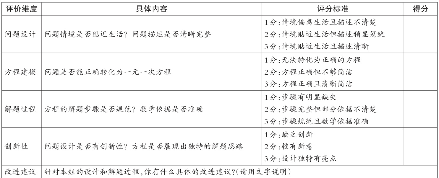 例如,在实际教学中,教师组织学生以小组为单位完成一个应用题设计任务,要求学生设计出生活化情境并用方程建模解决问题。完成任务后,小组之间可以进行相互评价,并使用教师提供的互评表进行系统的评价(详见表1)。