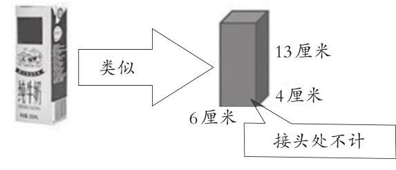 问题 :如上图(长方体牛奶盒包装图)所示,假设这个牛奶盒近似于长6 厘米、宽4 厘米、高13 厘米的长方体,若要对这盒牛奶进行包装,那么所需包装纸的最小面积是多少?这实际是在求解长方体的哪个部分呢?教师通过将牛奶盒的实物图抽象为长方体,并引导学生仔细观察平面图及其对应数据,让学生领悟到,要求他们求出包装 盒牛奶所需包装纸的面积,实质上就是要求他们求出长方体的表面积。学生根据教师的要求快速计算出牛奶盒的表面积,这不仅巩固了旧知识,还为后续的探究验证环节奠定了基础。