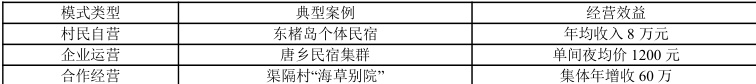 截至2024 年,荣成形成"一核多极"的民宿空间布局。核心区:宁津街道东楮岛村集聚民宿150 家,其中海草房民宿84 家,年接待游客20 万人次;拓展区:俚俚岛镇烟墩角村等8 个村落形成互补发展,整体出租率达65% ;辐射区:带动周边 21 个村发展关联产业,形成"十里古乡"旅游带。经营模式呈现多元化特征,如下表: