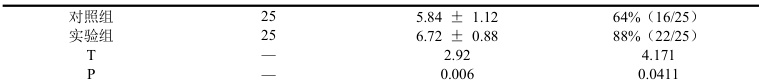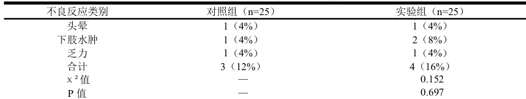 不良反应包括轻度头晕、乏力及下肢轻微水肿等,均为1~2 级,不需中止治疗。发生率如下:对照组: 12% (3 例);实验组:16%(4 例);差异无统计学意义(P=0.68)。详见表3。