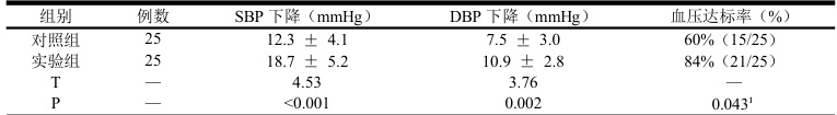 按照随机数字表法将50 例患者平均分为对照组与实验组,每组25 例。两组患者基础特征(性别、年龄、病程、体重指数、基础血压水平等)无显著差异(P>0.05),具有可比性。