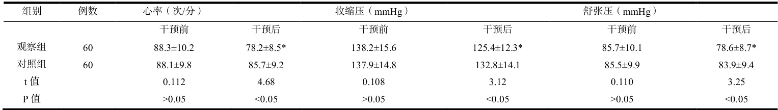 干预前两组患者心率与收缩压及舒张压比较差异无统计学意义 P>0.05 ),干预后观察组心率为(78.2±8.5)次/分,显著低于对照组的 85.7±9.2 )次/分( 1=4.68 , P<0.05 );收缩压为( 125.4±12.3)mmHg ,低于对照组的(132.8±14.1)mmHg( 1=3.12,P<0.05 ),舒张压为(78.6±8.7)mmHg ,低于对照组的(83.9±9.4)mmHg( t=3.25 , P<0.05 )。观察组生理指标改善程度均优于对照组,表明耳穴埋籽不仅能改善主观焦虑感受还能有效调节机体应激反应,稳定生命体征(见表2)。