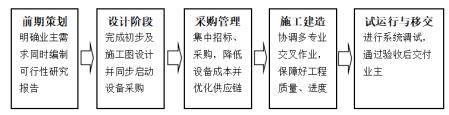 在具体的项目工程实践中,如图 1 所示,应用 EPC 总承包模式一般涵盖策划、设计、采购、施工、试运行与移交等主要流程。