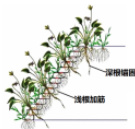 坡式护岸施工技术具有操作更为简便以及护岸效果突出等优势,是现阶段水利水电工程中应用范围较广的堤防护岸技术,多用于中小型河道以及流速较小的河道区域。坡式护岸技术手段在应用过程中应注意以下内容:其一,堤防护岸工程施工开始前,相关技术人员应对河道地形地势以及河道水流特点等情况进行全面、详细的调查,从而为后续护岸结构的设计和坡岸角度的调整优化提供可靠的参考。避免对堤防护岸实际作用的发挥带来影响,这也是坡式护岸工程项目极为重要的工作环节之一;其二,施工团队应做好护岸材料的选用以及护脚施工作业。坡式护岸施工技术从本质层面而言,是利用一定角度的岸坡以及相应的固定体系,实现岸坡整体稳定性的提升[2]。护脚区域作为坡岸承受水流冲击作用的主要区域,其施工质量对坡岸实际功能有着直接影响,无形中提升了坡式护岸工程中护脚施工阶段的重要性。除了要求施工团队合理选用硬度更高的石料,并采用铅丝捆绑等手段使石料形成体积结构较大的枕体,还需要施工团队能够严格按照施工图和相关标准规范进行施工作业;其三,可以根据坡岸具体情况适当选用护岸植物。目前,坡式护岸施工中较为常用的植物,主要包括浅根系草本植物和深根系木本植物两大类别。浅根系草本植物的特点体现在具备一定的加筋作用,而深根系木本植物则是可以利用其更为粗壮发达的根系起到突出的锚固作用。护岸植物在实际应用中,可以采取河道底部选择沉水植物、坡岸区域选择浅根植物与深根植物交替种植的方式,如图1 所示。