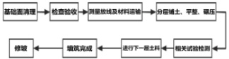 堤身填筑施工是水利水电工程中堤防护岸工程的重要施工环节,其施工质量对堤防护岸工程整体安全性和稳定性有着直接影响。堤防护岸工程中堤身填筑施工主要包括施工准备工作、分层碾压、试验检测以及修坡处理等,如图2 所示。首先,堤防护岸工程中堤身填筑施工准备工作,是为后续填筑施工作业的正常、有序开展提供良好条件,其具体工作涉及基础面清理、测量放线以及材料选用和检验等内容。基础面清理工作主要是清除基底软土层和泥浆等杂质,并对基底进行平整和夯实处理。基底清理工作之后则是需要依据施工图和相关技术要求开展现场测量放线作业,以便确定填筑施工区域和目标高程。施工材料选用及其质量检验,是填筑施工准备工作的核心内容之一。应综合考量渗透能力、抗冲刷能力等相关因素进行选择,并切实落实施工材料入场前的质量检验工作[4]。比如,填筑施工中的防渗核心材料,应选择黏结性更好的黏土,外围则是可以选用排水性能更好的砂砾石;其次,堤防护岸工程中堤身填筑施工大多采用了进退错距分层碾压施工工艺,其施工要点包括以下几点:(1)铺土碾压施工阶段,施工人员应把控好每层松铺厚度,并秉持匀速、轨迹重叠等原则,按照规定碾压次数使用振动压路机对土层进行压实。对于部分振动压路机难以压实的边角区域,施工人员可以使用蛙式打夯机对相关区域进行补压处理。(2)每层铺土碾压施工作业完工后,相关技术人员应借助全站仪、微波快速测定仪、核子密度仪等仪器设备和检测方法,对施工区域填筑厚度、土料含水量以及压实度等施工效果进行细致检验,确保填筑施工质量符合设计要求和相关标准规范。(3)应针对特殊施工区域制定专项应对方案,如新旧填筑体结合面、分段填筑过程中的相邻作业面施工以及不同渗水性材料交接施工区域等。其中,新旧填筑体结合区域施工除了应及时清理表明浮土,还可以采用阶梯形接茬施工工艺,辅以铺设双向土工格栅等手段保证填筑体施工质量。分段填筑过程中的相邻作业面施工环节,可以适当增加接缝位置的碾压次数,以便能够提升填筑体整体强度。不同透水性材料交接部位可以设置厚度适宜的砂砾石过渡层,能够有效避免填筑施工过程中出现渗透破坏等情况。(4)应做好填筑体维护工作。在堤身填筑施工过程中如果遭遇雨雪等恶劣天气条件,施工人员应及时在作业面铺设防水土工膜,并在可能积水的区域开挖导流盲沟,最大限度的降低恶劣天气对填筑体结构稳定性和安全性产生的影响。
