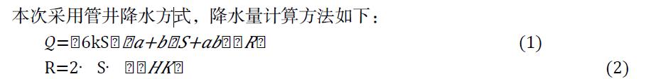 其中,k 代表施工速度;a 代表降水长度;b 代表降水宽度;R 代表降水影响半径;S 为最大水位降深;H 为潜水 含水层厚度。降水井施工时,前面 1.4 至 4 米的范围需人工开挖,在确认该区域无地下管线后,方可转为机械作业。护筒外侧采用黏土严密封堵,防止后续出现渗水及孔壁坍塌的情况。