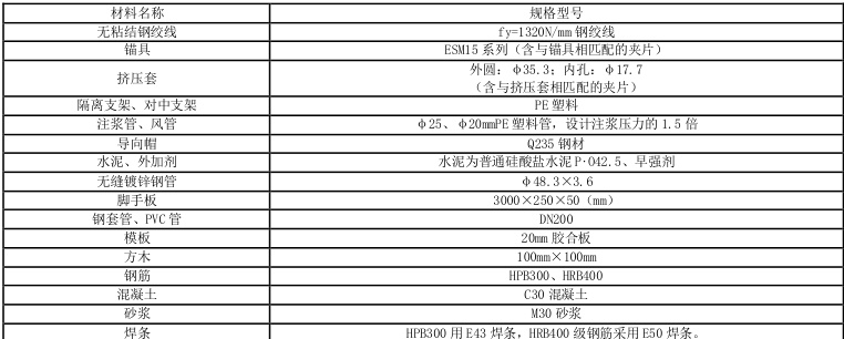 施工用水符合《混凝土用水标准(JGJ63)》,宜用饮用水。内、对中、张拉段隔离支架为 PE 塑料,前端导向帽用钢管自制。注浆管、风管