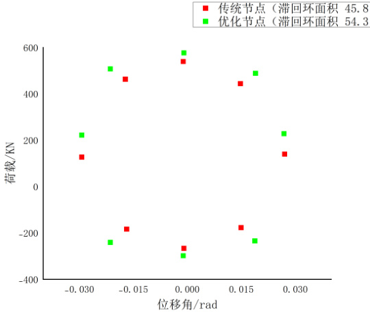 基于低周反复加载实验数据,滞回曲线对比结果(图 1)直观揭示了节点抗震性能的关键差异。如图所示,优化节点滞回环呈现显著扩大的饱满形态,表明连接技术创新有效提升了塑性变形能力。