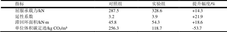 数据表明:实验组节点屈服承载力提升14.3%至328.6 kN,延性系数提高21.9%达3.9,等效粘滞阻尼系数增大 18.5% 。特别值得注意的是,优化后节点在保持抗震性能提升的同时,单位体积碳足迹降低 53.7% (118.7 kgCO2/m3) ,再生骨料利用率达72.4%,实现绿色与抗震性能的协同优化。