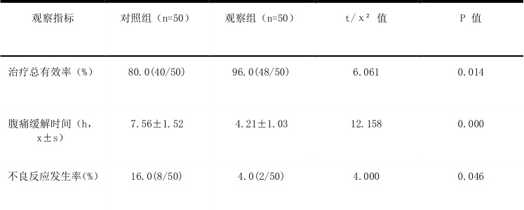 治疗总有效率:依据患者临床症状的改善状况来予以判定。显著效果体现为:经治疗后,诸如腹痛之类的症状全然消失,各项检查指标均回归正常;有效果则表现为:治疗之后,腹痛等症状显著减轻,各项检查指标有所好转;无效的情况是:治疗过后,腹痛等症状未出现明显改变,甚至此外加重趋势,各项检查指标未获改善。