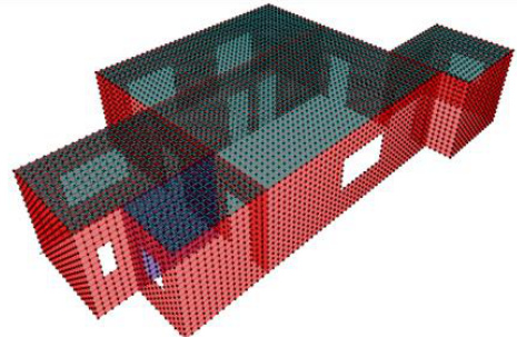 本研究选用SAP2000 软件进行有限元分析根据湘潭市某住宅楼顶层建筑平面图,进行1:1 整层模型建立,考虑最不利因素,本次的研究对象为西面室内隔墙(图中紫色墙体),其三维视图模型如下图2-1 所示: