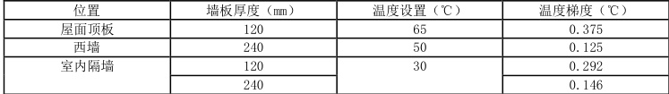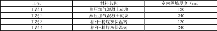 虽然通常室内隔墙厚度采用的为120-180mm,但是考虑到空调效应的影响,240mm 墙体可通过增加保温材料层厚度,提升热阻值,减少热量传递,使室内温度更稳定,降低空调系统的运行负荷,符合节能和环境控制要求。故为为分析新型材料在不同室内刚度下的温度应力变化规律,本次研究共设立了空调效应在四种不同情况下的工况,具体见表2.3: