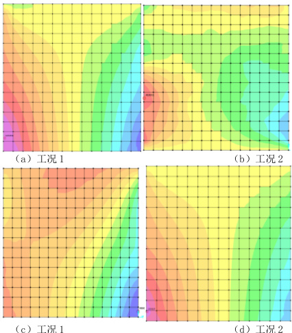 根据工况 1-4 的温度应力云图可知,与外墙相邻的室内隔墙其最大拉应力值均出现在角点处,但由于材料性能的不同,其最大拉应力值各有不同,具体见表3.1: