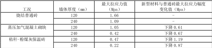 结合笔者关于空调效应在普通砖混结构的有限元研究可知,当室内隔墙在使用了蒸压加气混凝土砌块及秸秆-粉煤灰保温砖两种新型材料以后,不论是隔墙厚度在 120mm 厚或者 240mm 厚,其最大应力都有较大幅度的下降,具体下降幅度,详见表3.2: